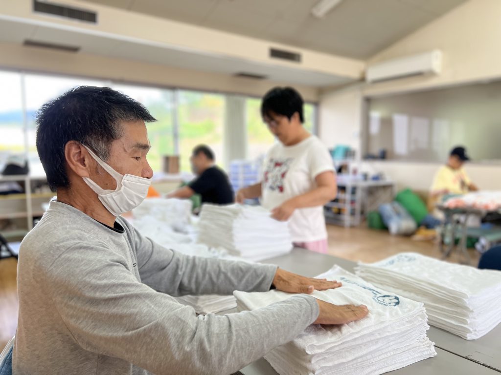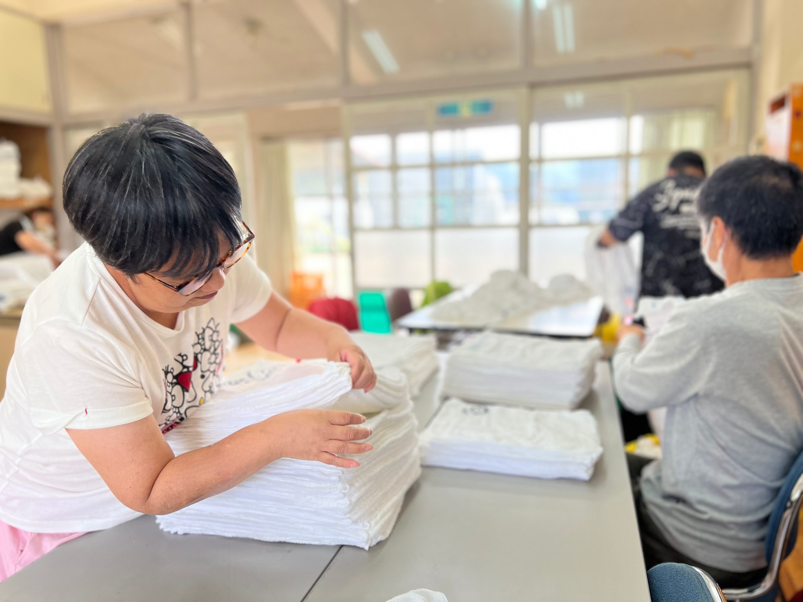 地域のレンタルタオル事業者さんからいただく、洗濯済のタオルの分別・整頓作業