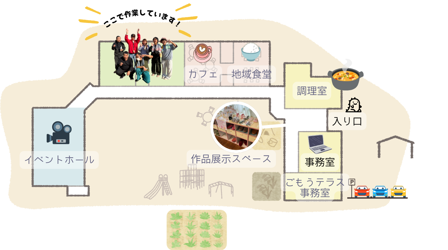 コミュニティカフェやイベントなどを通して地域のさまざまな⼈が⾏き交う、オープンで穏やかな環境の中で、⼈とのつながりを感じながら、お互いの⼈⽣を豊かにしていける場をめざしています。